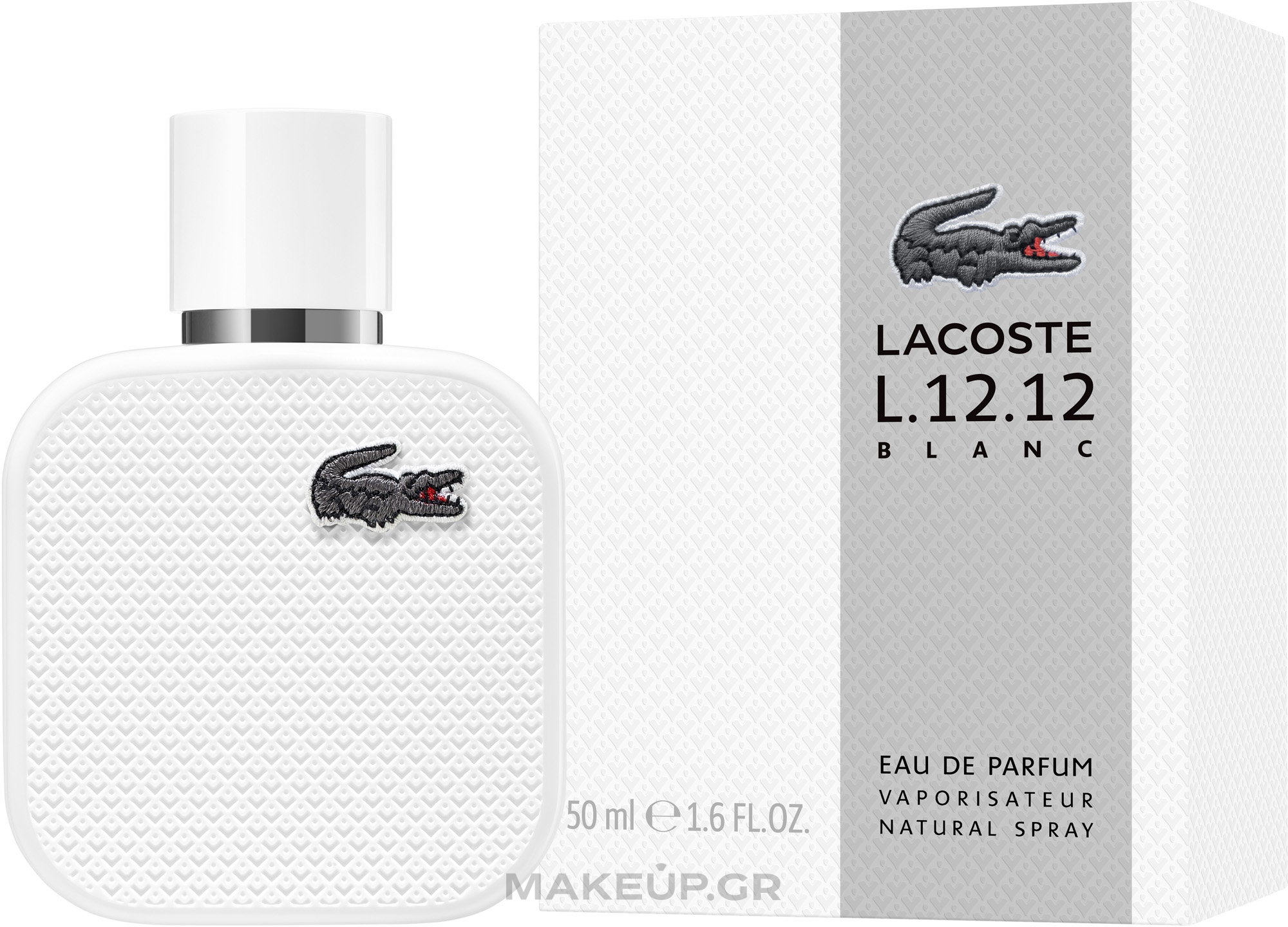 Το L.12.12 Blanc Eau de Parfum, εμπνευσμένο κι αυτό από το εμβληματικό polo μπλουζάκι Lacoste, αποκαλύπτει μια ακόμα πιο γεμάτη αυτοπεποίθηση αρρενωπότητα με μια έντονη ξυλώδης αρωματική μυρωδιά. Η λεμονάτη νότα λάιμ και η αίσθηση ευκάλυπτου αναμειγνύονται με το χυμώδες πεύκο κα το πλούσιο κέδρο, καταλήγοντας σε μια αίσθηση εκλεπτυσμένης άνεσης. Το μπουκάλι διακοσμεί ένας μαύρος γκρι κροκόδειλος για να σηματοδοτήσει την συγκέντρωσή του στο Eau de Parfum.